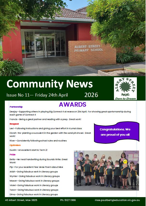 On Friday of each week Sharon Madeley, our Administration Officer, produces an Albert Street newsletter. The newsletter includes information about upcoming events, celebrates student achievements, kind reminders and other information.