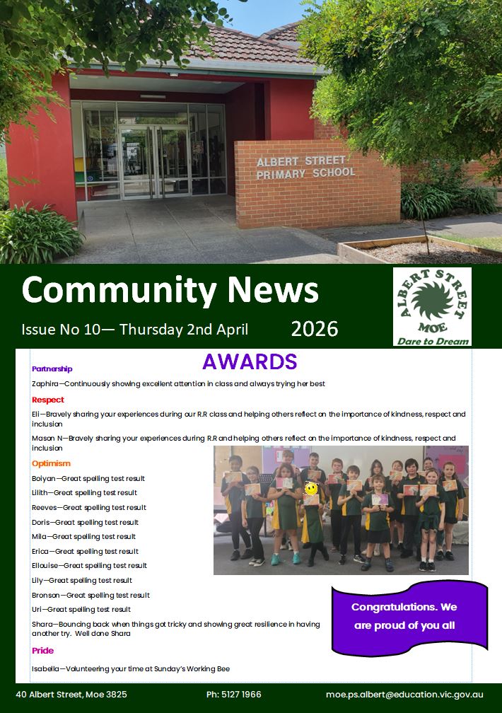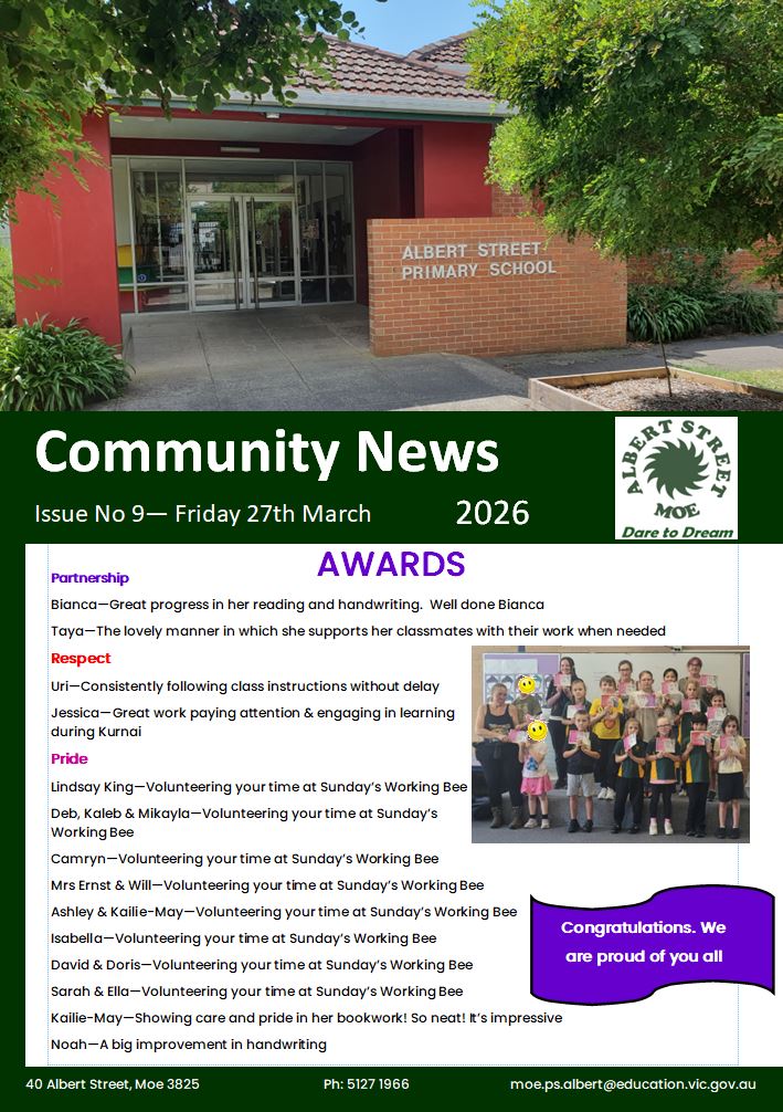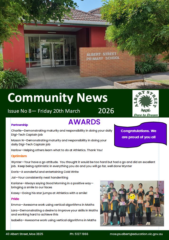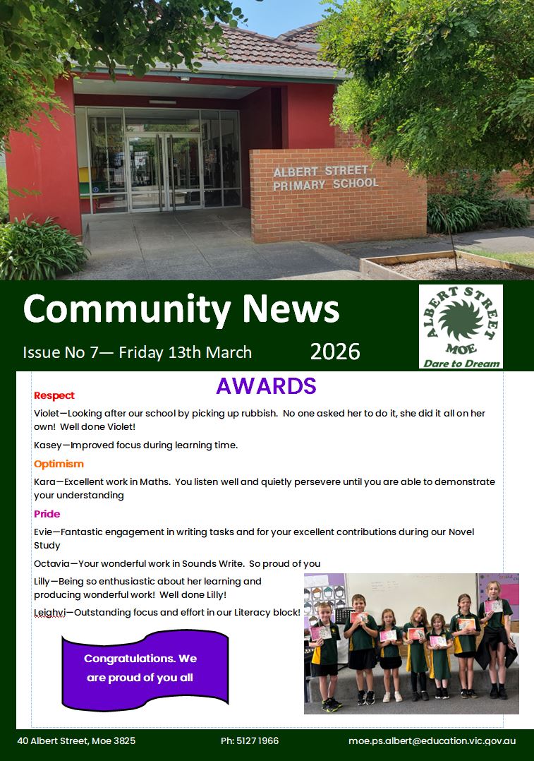 On Friday of each week Sharon Madeley, our Administration Officer, produces an Albert Street newsletter. The newsletter includes information about upcoming events, celebrates student achievements, kind reminders and other information.