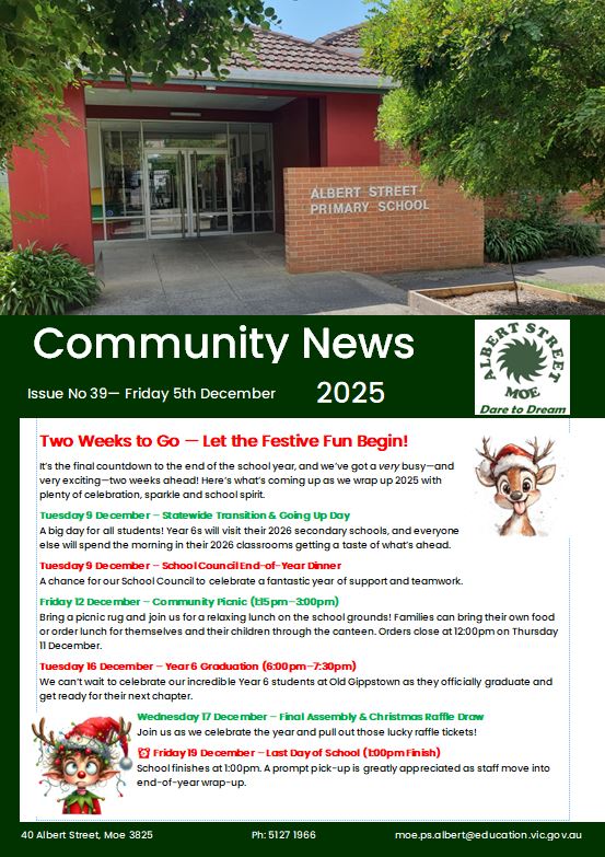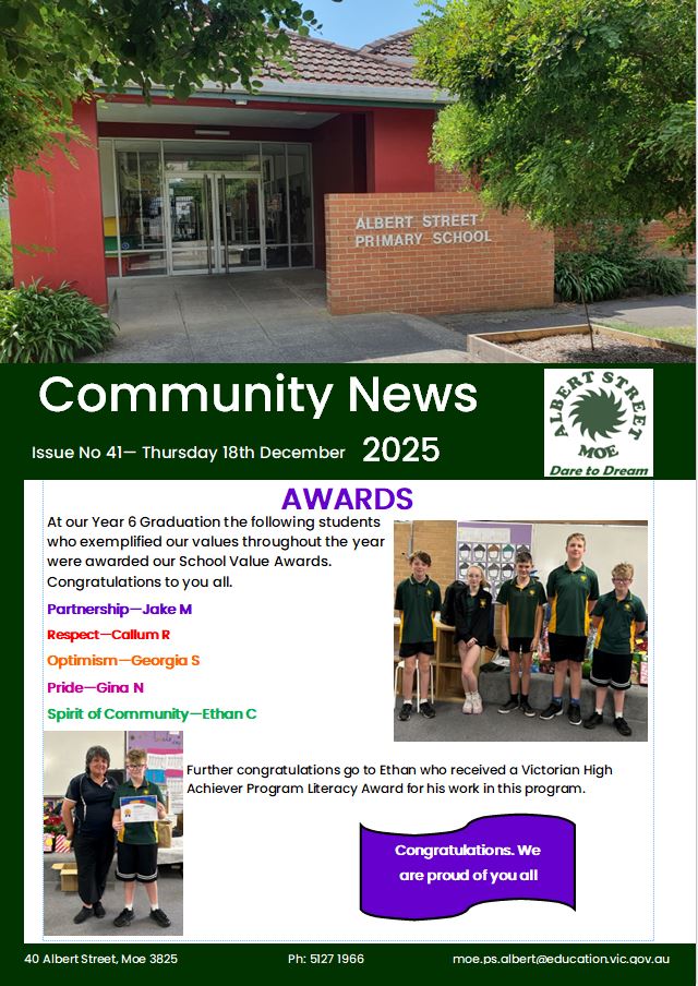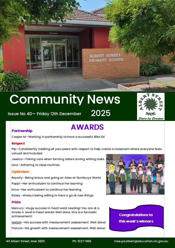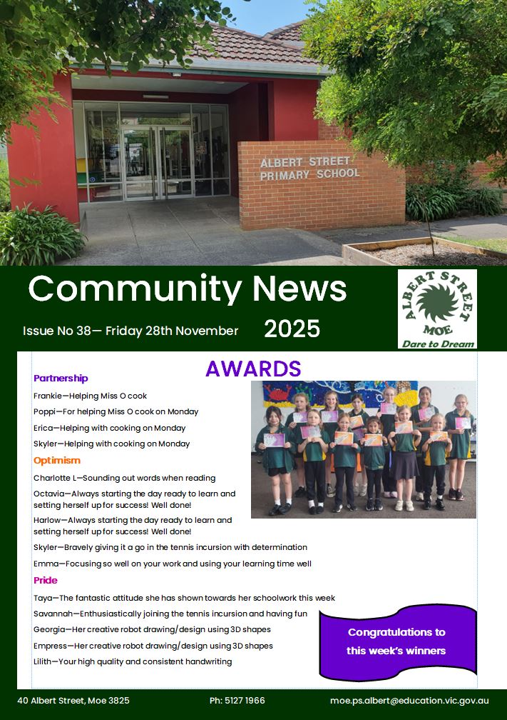On Friday of each week Sharon Madeley, our Administration Officer, produces an Albert Street newsletter. The newsletter includes information about upcoming events, celebrates student achievements, kind reminders and other information.You can find copies of recent newsletters below: